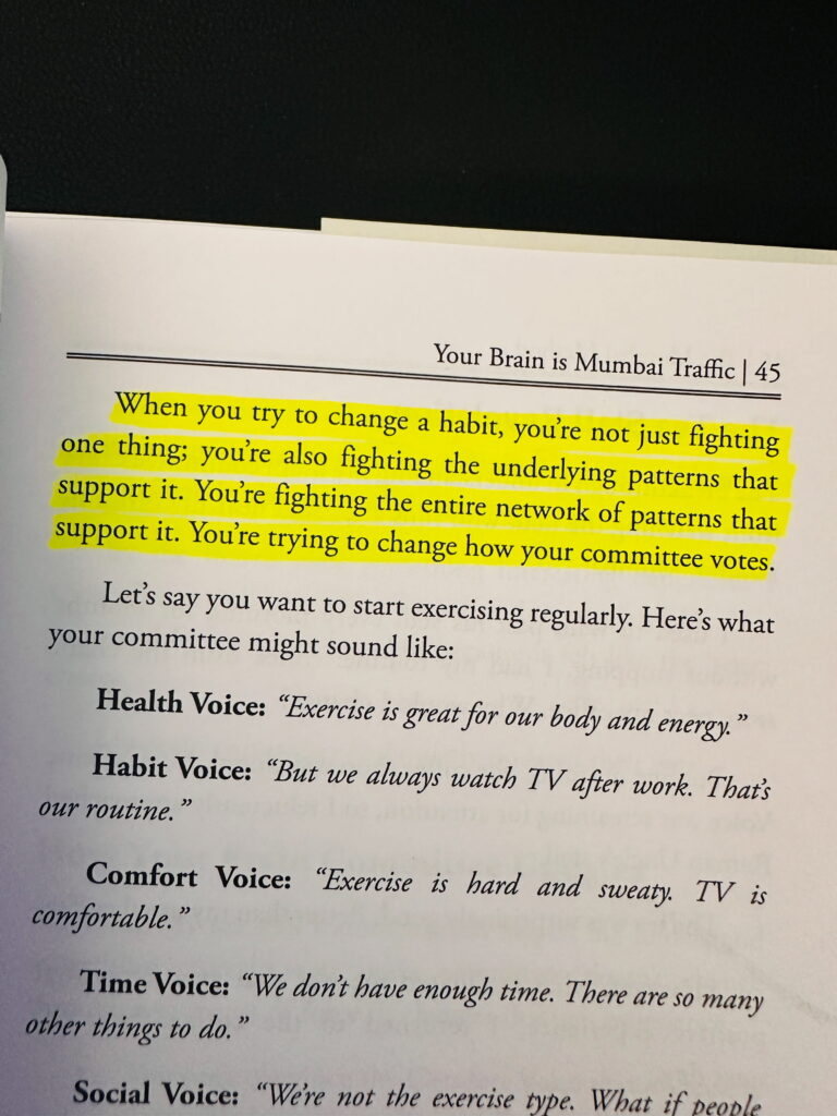 Imagine this committee like the organized chaos of Mumbai traffic. The buses are your Habit Voice, stubbornly sticking to reliable, familiar routes. The private cars are your Comfort Voice, prioritizing safety and ease. When you try to suddenly start a difficult workout routine, your Health Voice might vote “yes,” but your Habit, Comfort, Time, and Energy voices are all aggressively voting “no”.